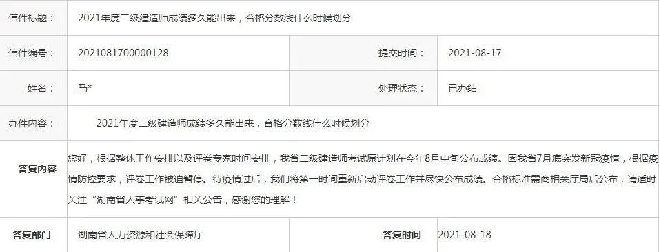 您好,根據整體工作安排以及評卷專家時間安排,我省二級建造師考試原計劃在今年8月中旬公布成績。因我省7月底突發新冠疫情,根據疫情防控要求,評卷工作被迫暫停。待疫情過后,我們將第一時間重新啟動評卷工作并盡快公布成績。合格標準需商相關廳局后公布,請適時關注“湖南省人事考試網”相關公告,感謝您的理解!